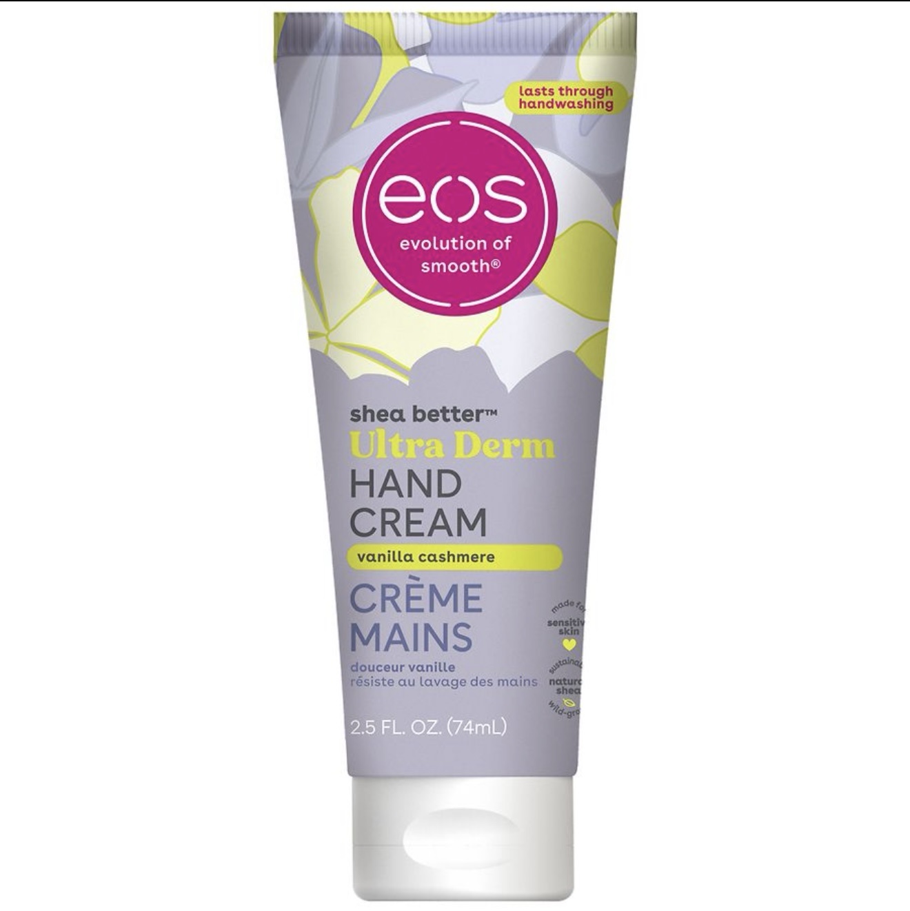 Eos hand cream deeply moisturizes dry hands with shea butter and natural oils, leaving skin soft, smooth, and non-greasy.